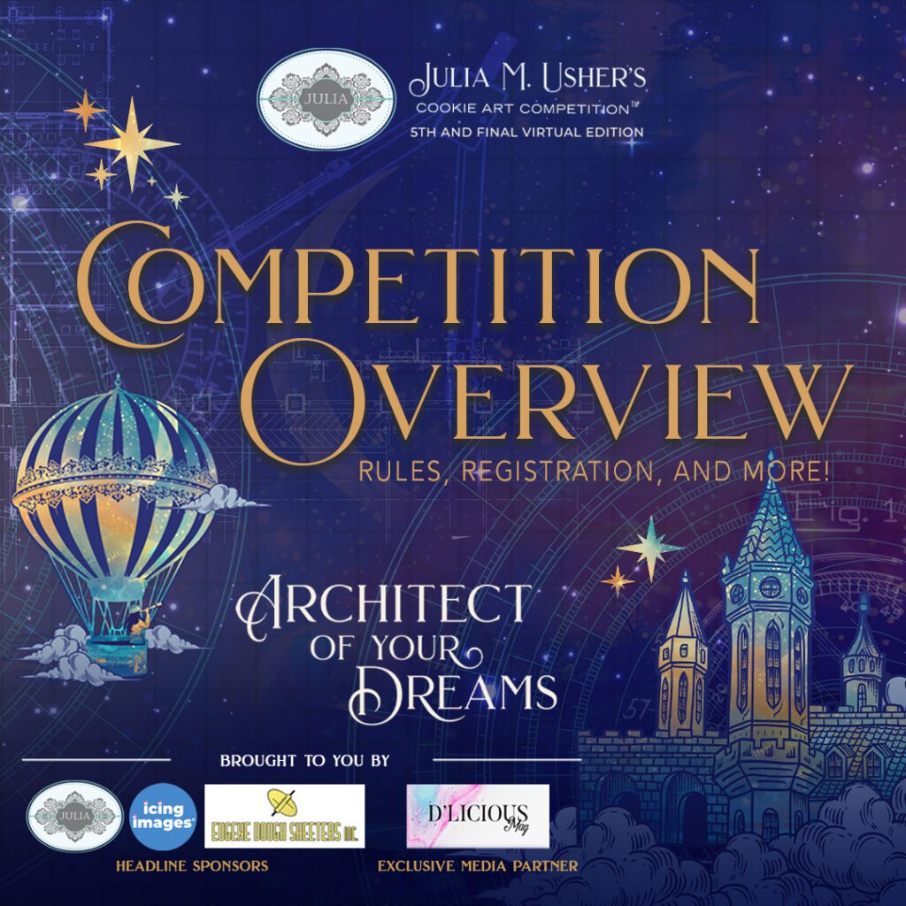 At last, the rules for the 2026 Julia M. Usher’s Cookie Art Competition™ are here, and reg has opened! This year’s competition, which will be Julia’s last one before she heads into cookie-retirement, promises to be her best ever! For the first time in competition history, Julia has aligned herself with an exclusive media partner, the illustrious D’licious Magazine, to give sponsors more exposure across a wider range of platforms, and to take competition participation across the world to the next level. Together, Julia and Kelly Jane, D’licious Magazine‘s founder and editor, have added a new “Headline Sponsor” level, sponsor benefits that extend into D’licious Magazine‘s online platforms and monthly print publication, and perks galore for entrants and winners.