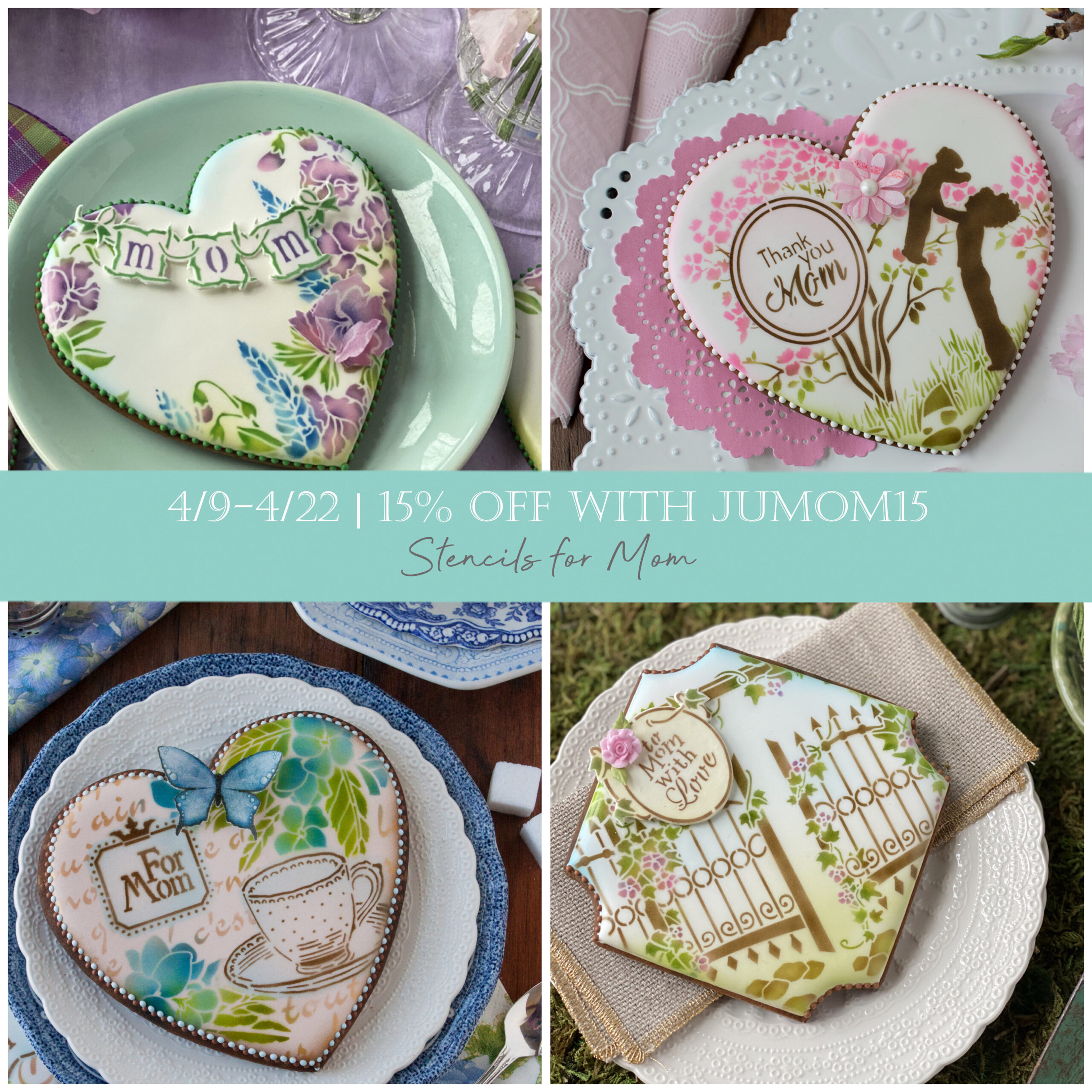 I know, I know, moms are quite dazzling, but so is my latest stencil sale! 😀 In prep for your mom’s special day (which is fast approaching, BTW), why not gear up with some new stencils designed to make her Mother’s Day celebration extra sweet? Sound enticing? Well, my sale is just the ticket to help you out! With code JUMOM15, you can get 15% off every Mother’s Day stencil or stencil set on my partner Confection Couture Stencils’ site if you shop by April 22.