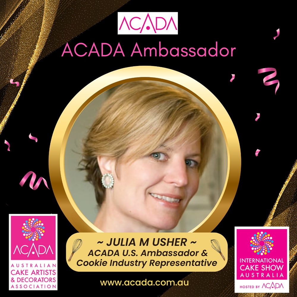In mid-2025, Julia was invited to serve as US Ambassador and Cookie Industry Representative for the Australian Cake Artists & Decorators Association (ACADA), the premier cake industry association in Australia and New Zealand, and also host of International Cake Show Australia (ICSA), one of the largest cake shows in the world. Julia is among a handful of international sugar artists who have been extended this invitation, which makes the appointment an honor as well as a serious commitment. Julia looks forward to applying her skills in business strategy and sponsor development (hard-earned while working at Bain & Company, an international management consultancy, from 1987 to 1997) to helping ACADA expand its impact worldwide.