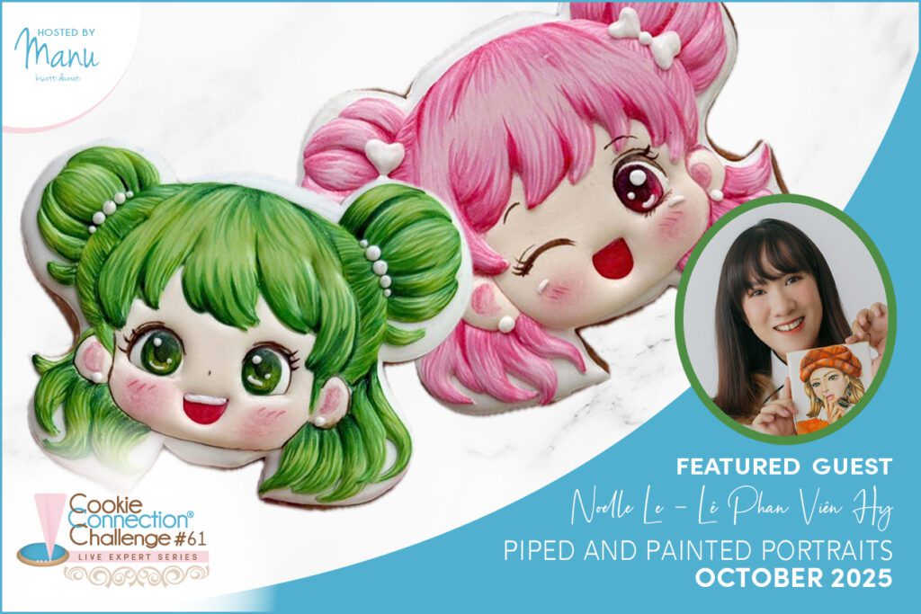 I’m back with the 61st Cookie Connection Challenge (the eleventh in my new-ish* Watch-Learn-Create series), and it’s once again hosted by the wonderful Manu Pezzopane who has an uncanny way of asking our featured guests all the right questions at just the right times! Speaking of featured guests . . . our guest for this challenge is award-winning cookie artist Noelle Le-Lê Phan Viên Hy, and she’s going to eliminate (forever!) any fears you may have about piping and painting portrait cookies. In her kickoff video tutorial for this challenge, Noelle shows how to create a charming chibi character, paying particular attention to painting the hair and eyes, which are often the most difficult features to master. Noelle’s thoughtful choice to render a chibi makes this video lesson all the more approachable, particularly for beginners. Piping and painting a chibi-style portrait is arguably easier than piping and painting a regular portrait, because chibis have relatively few facial details, and drawing them cutely doesn’t require precise feature placement and proportions. Plus, Noelle provides three chibi templates in her resource list (which comes with the tutorial) that can be used as cookie-cutting and piping guides, as well as plenty of tips for transferring images, especially without use of a projector. After a brief intro, the bulk of Noelle’s demo focuses on her layered piping methods using two different icing consistencies, and how she paints hair and eye highlights/lowlights to add lifelike depth and dimension.