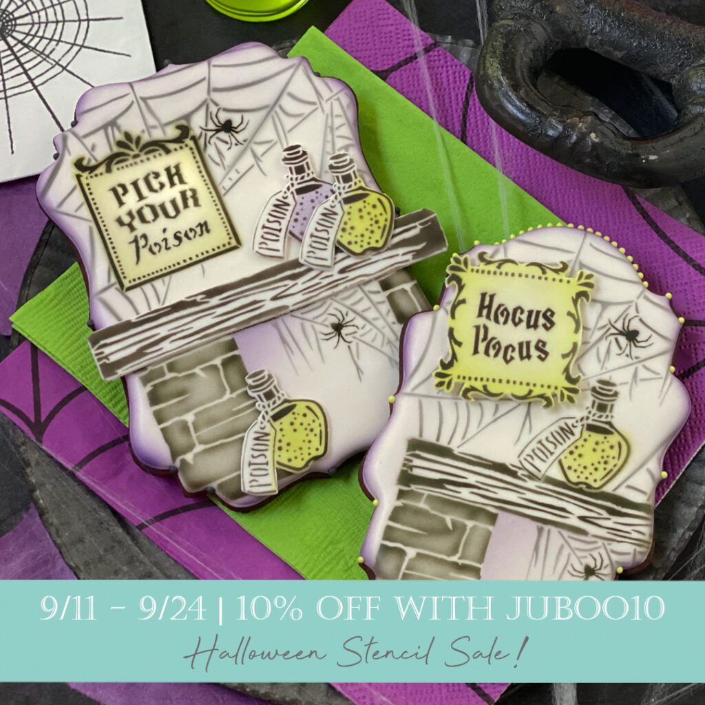 SHOP the Halloween stencil collection on my partner Confection Couture Stencils’ site. Again, be sure to use code JUBOO10 at checkout. And if you have any questions about the stencils used on the cookies pictured here, just let me know in the comments below, and I’ll be happy to guide you (sans silly puns)!