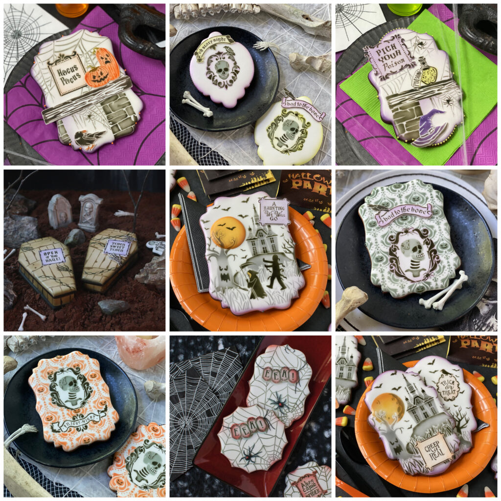 Anyboo, to get you cookie-ready for that spook-tacular day, I’m offering 10% off all Halloween stencils on my partner Confection Couture Stencils’ site with JUBOO10. The sale runs from today, September 11, until September 24, but don’t delay because you’ll no doubt want ample time to play with these stencils before any cookie gobble-ins arrive. Please check out my specially curated Halloween collection (link below), and prepare to find many boo-tiful sets like those used to make the cookies shown here. (Have no fear, I think I’ve finally exhausted my lexicon of Halloween puns! 😉)
