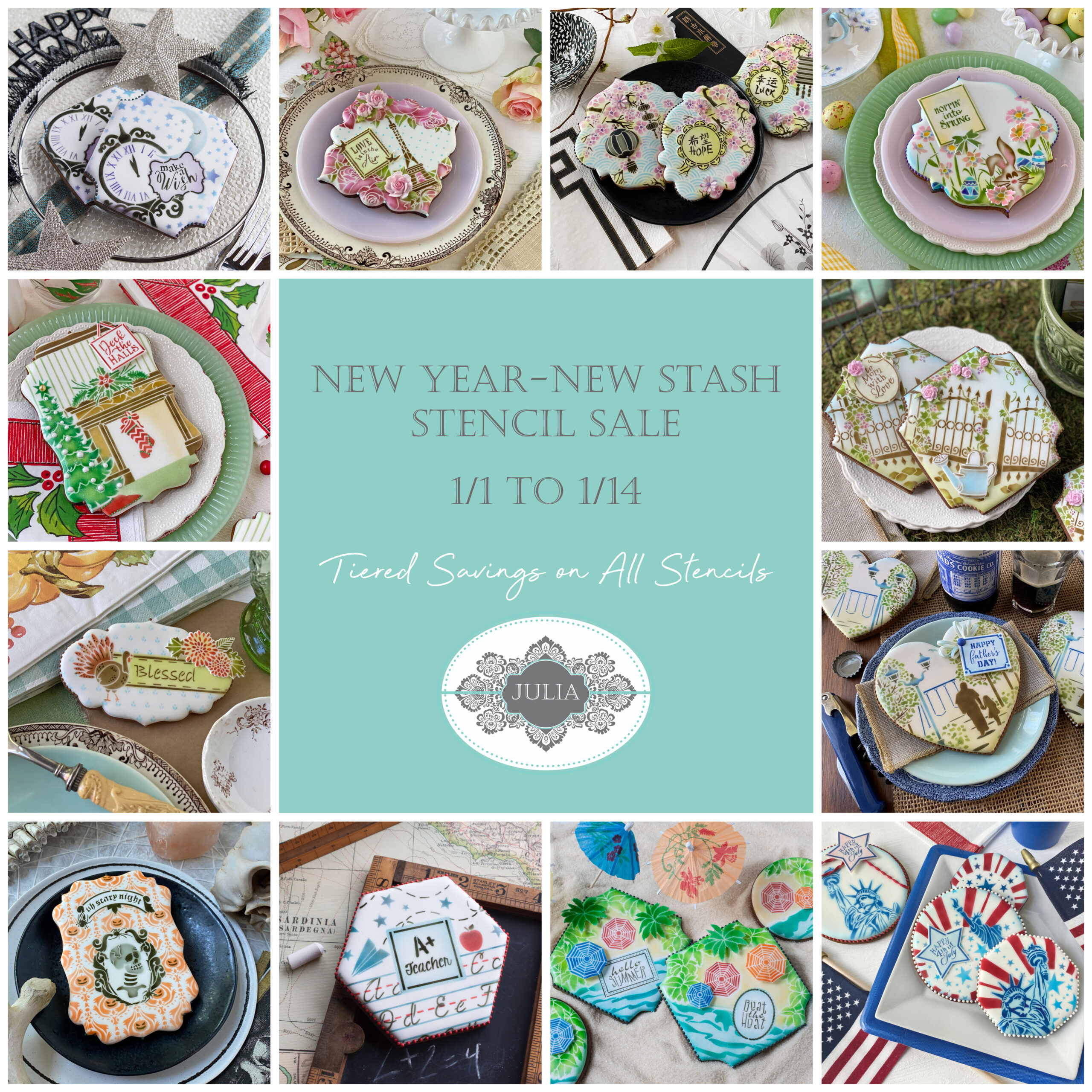 Why not ring in the new year with new stencil inventory and a jumpstart on 2026 cookie planning?! Both my partner Confection Couture Stencils and I have nearly unlimited stencil designs, with many options for every month of the year. Pictured in the image below (and above) are some of my personal fave designs from my collection, but there are plenty of other stencils where these came from!
