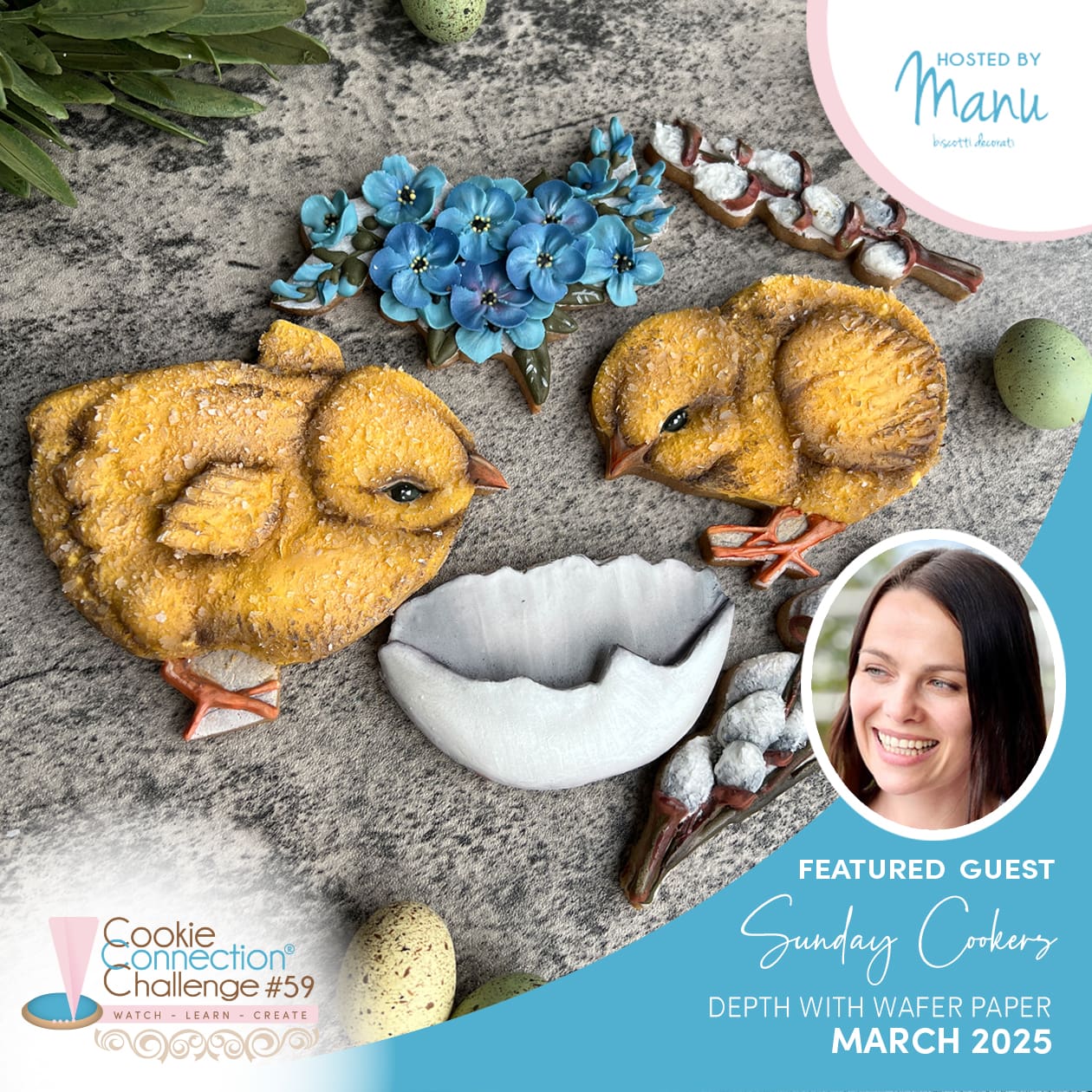 My 59th Cookie Connection Challenge (the ninth in the new-ish Watch-Learn-Create series) is hosted as always by the lovely Manu Pezzopane and features Anna Oliinyk of Sunday Cookers for the second time. (In 2023, Anna was the featured guest for Challenge #54 where she demonstrated how to make her signature lifelike cookie bouquets.) For Challenge #59, Anna focuses on two wafer paper techniques that lend interesting depth – meaning texture and dimension – to cookies. The first technique is “wafer paper shredding”, which refers to grinding or shredding wafer paper into tiny pieces. This shred is then sprinkled onto wet royal icing to add fluffy texture. The second technique is called “wafer paper plating”, which involves cutting relatively large pieces of wafer paper and then attaching them to cookies with thick royal icing to add dimension. In her challenge kickoff tutorial, Anna recreates the chick, eggshell, and pussy willow branches shown in the image above as a means of illustrating these two techniques as well as 10 others! Anna’s cookie set is clearly perfect for Easter and other springtime events, however, the wafer paper techniques that she teaches can be applied to cookies for every season and occasion as she shows at the tutorial’s outset. And that’s not all: Before encouraging viewers to enter Challenge #59 (now open through June 8, 2025), Anna demonstrates a final “bonus” hydrangea flower cookie that includes no wafer paper whatsoever, but which rounds out her springtime set quite beautifully.