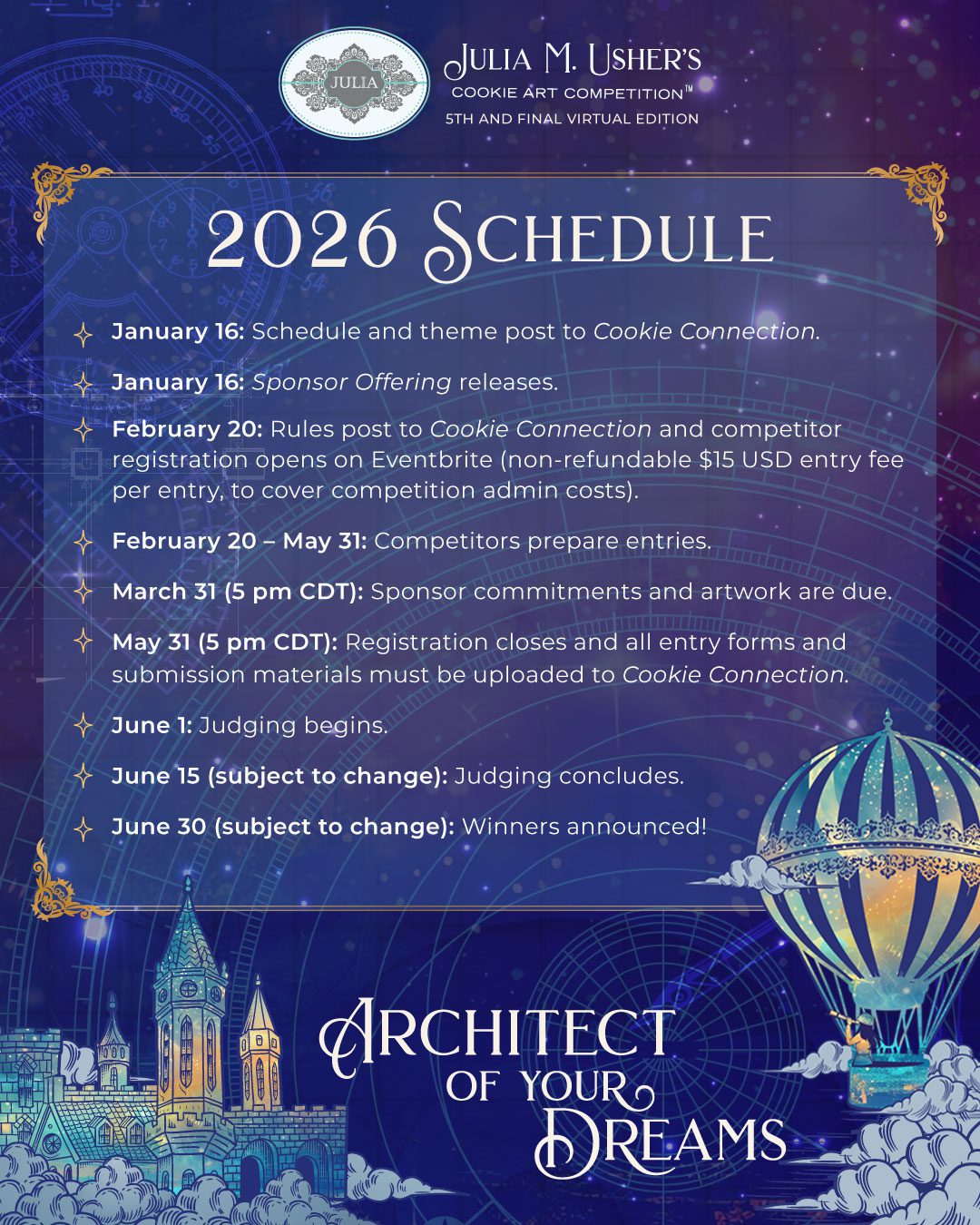 Like the last few years, the competition will be online so that entrants from all over the world can participate. The more, the merrier – so please spread the word to any cookiers who might be interested. Again, the official 2026 Competition Overview with the complete set of rules will post on February 20 (give or take), but to jumpstart the excitement (and your planning!), I’m announcing the schedule and theme today!